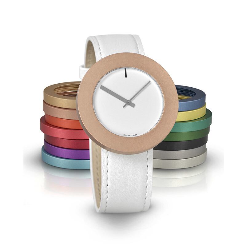 世界的に有名なLella & Massimo Vignelli(レッラ&マッシモ・ヴィネッリ)がデザインした希少な逸品。リングカラーが手軽に交換でき、 その日の気分に合わせた色使いをお楽しみ頂けるモデルです。